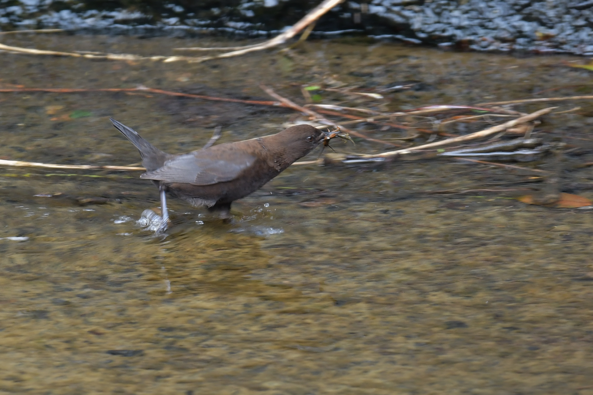 さっそく親が餌を咥えてやってきました。が、巣に飛び込まず川の浅いところを走っていきます。